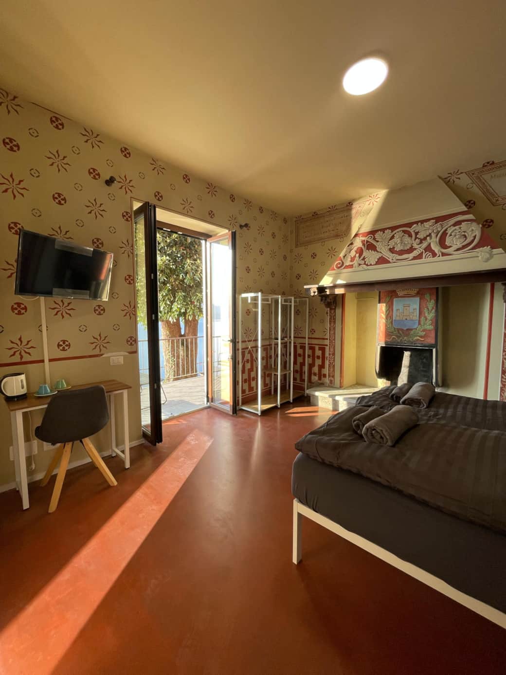 Cette chambre double est ornée de fresques originales de la fin du XIXe siècle et d'une cheminée d'époque de la même période. Son point fort est sa grande terrasse privée équipée de chaises longues, offrant une vue imprenable sur le lac pour des moments de pure détente.